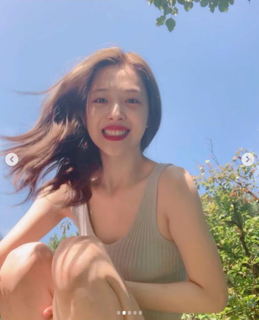 사진 속 설리는 니트 뷔스티에를 입고 밝은 날씨에 환한 미소를 짓고 있다. 푸르른 하늘을 배경으로 그보다 더 눈부신 미소와 미모가 눈길을 끈다.