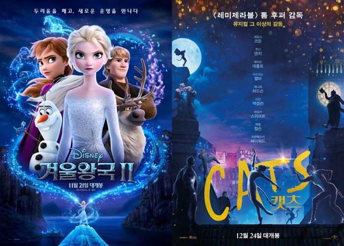 올 겨울 극장가는 뮤지컬 영화 ‘캣츠’와 ‘겨울왕국 2’가 화려하게 장식할 것으로 보인다.