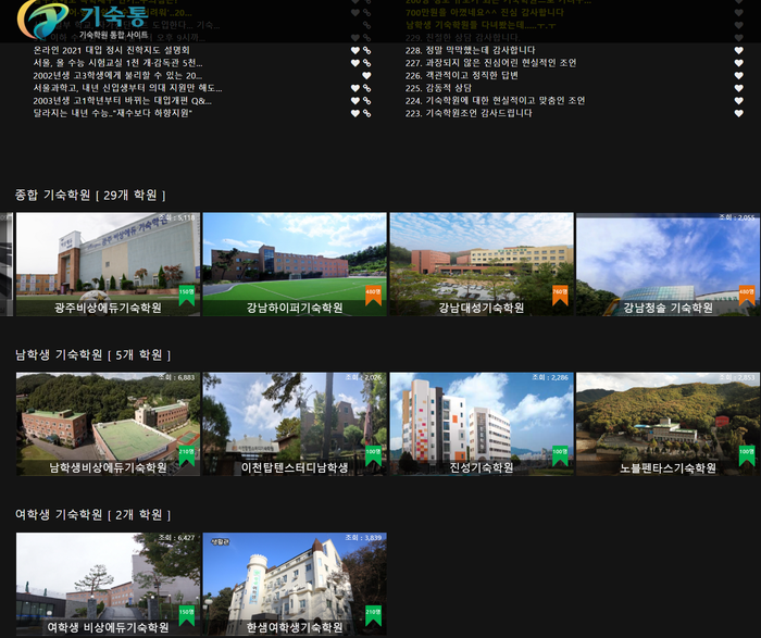 그 중 학원마다 지향하는 공부 방식에 따라서는 수업식 기숙학원·반독학식 기숙학원·독학식 기숙학원으로 나뉘며, 지역에 따라 편차와 수준에 차이를 보여 위의 요소를 파악해 기숙사학원에 관한 정보제공 서비스를 운영한다.