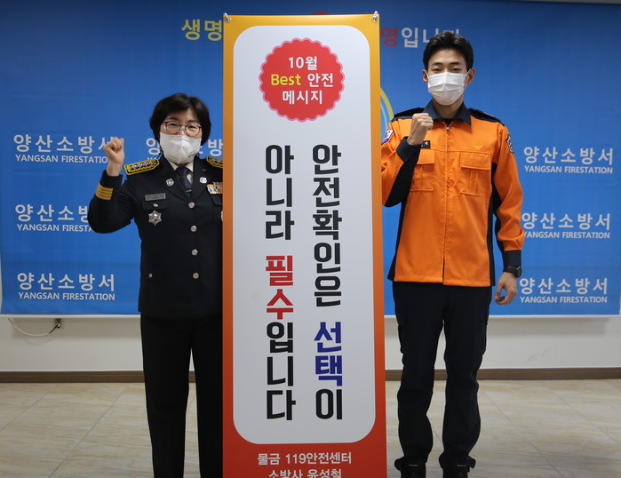 10월 선정된 「하루를 여는 안전메시지」는 물금119안전센터 윤성철 소방사의 「안전확인은 선택이 아니라 필수입니다.」라는 메시지가 10월의 Best 안전메세지로 선정되어 한 달 간 교대점검 시 소방서 공식 안전구호로 제창할 예정이다.