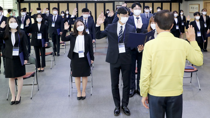 이날 임용식은 코로나19 방역지침을 준수한 가운데 임용장 수여, 선서문 낭독, 군수님 인사말씀 순으로 진행됐으며, 신규공직자 대표로 선서문을 낭독한 이경도 씨와 박주희 씨는 “합천군의 발전에 기여하고 군민을 위한 공직자가 되겠다”는 포부를 밝혔다.