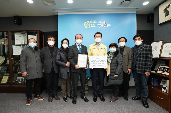서울 성북구가 최근 장위2동 주민자치위원회로부터 코로나19 예방을 위해 힘쓰는 구 보건소 및 재난안전대책본부 공무원들을 위한 손 소독제 500개(100만원 상당)를 전달받았다. 사진은 이승로 구청장(왼쪽에서 다섯 번째)과 관계자들의 기념촬영 모습. (사진제공=성북구청)
