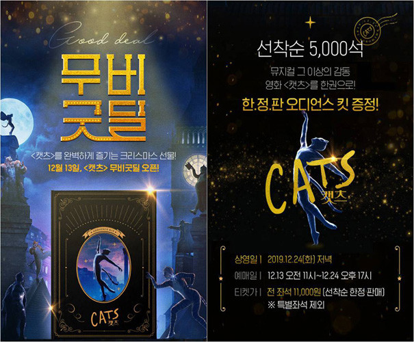 CGV 무비굿딜은 선착순 5,000명 한정으로 진행되는 이벤트다. 무비굿딜을 통해 개봉 당일 원하는 상영 극장과 상영 시간을 예매한 후 당일 관람을 인증하면 ‘캣츠’ 오디언스 킷을 증정한다.