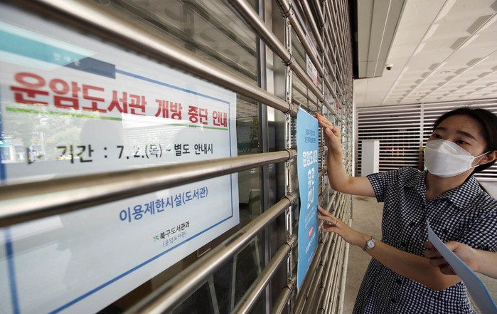 2일 오전 광주 북구 운암도서관에서 직원들이 최근 지역내 코로나19 확산에 도서관이 휴관에 들어가게 돼 출입문에 안내문을 붙이고 있다. 광주시는 코로나19 지역사회 확산방지를 위해 방역지침을 사회적 거리두기 2단계로 격상시켰다.