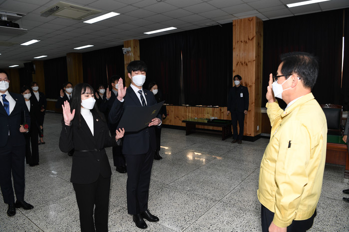 이 날 개최된 신규공무원 임용장 수여식은 지난 11월에 개최됐던 것과는 달리 신규임용자 가족은 초청하지 않고, 발령자 본인만 참석케 하여 규모를 최소화했다.