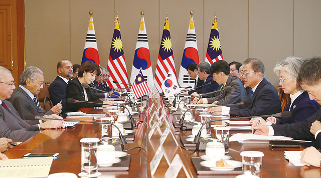 문재인 대통령과 마하티르 빈 모하맛 말레이시아 총리가 28일 청와대에서 정상회담을 하고 있다. /연합뉴스