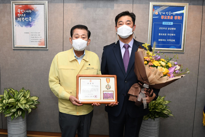 인천 강화군은 최근 2021년 다문화 인식개선과 사회통합에 기여한 모범 다문화 유공자 수상자 양성필씨에게 표창을 수여했다. 사진은 수여식에서 유천호 군수(왼쪽)와 수상자가 기념촬영을 하는 모습.(사진제공=강화군청)