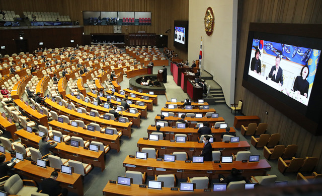 2일 오후 국회 본회의에서 열린 대정부 질문에서 미래통합당 주호영 의원이 신종 코로나바이러스 감염증(코로나 19) 대처 미흡 등을 지적하며 당시 청와대에서 진행된 행사를 보여주고 있다. /연합뉴스