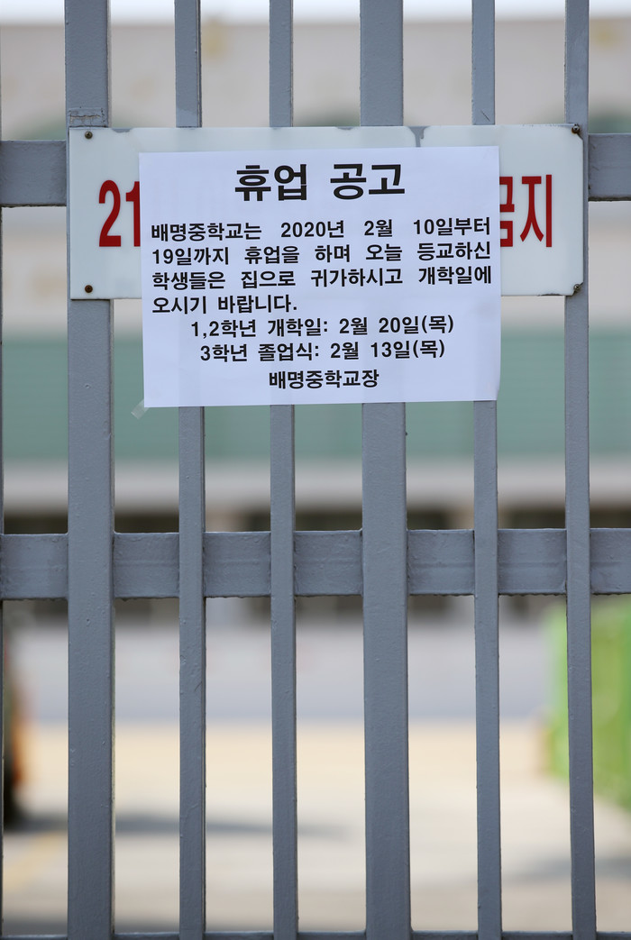 신종 코로나바이러스 감염증 확산 방지를 위해 10일부터 오는 19일까지 휴업에 들어간 서울 배명중학교 앞에 관련 공고문이 붙어 있다.