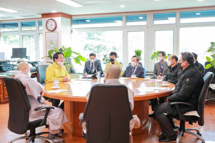 충남 아산시는 최근 시청에서 아산시기독교연합회, 천주교아산지구연합회, 불교사암연합회 등 종교지도자들과 간담회를 열고 코로나19(우한폐렴) 지역사회 확산 방지에 적극 힘쓰기로 했다. 사진은 오세현 시장(왼쪽에서 두 번째)과 종교지도자들이 이야기를 나누는 모습.(사진제공=아산시청)