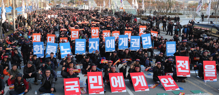 민주노총 공공운수노조 화물연대본부 관계자들이 26일 오후 세종시 정부세종청사 국토교통부 앞에서 화물연대 총파업 선포 결의대회를 하고 있다.