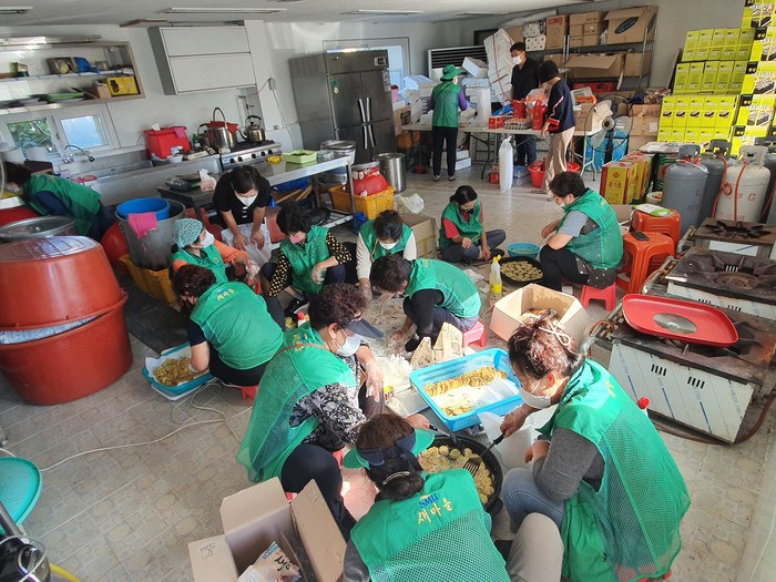 인천 강화군 송해면 새마을남녀지도자회는 최근 추석 명절을 앞두고 지역내 홀몸노인 및 노인부부 70가정에 직접 부친 모듬전·송편 등을 전달하며 안부를 살폈다. 사진은 이날 봉사자들이 각종 전을 만들고 있는 모습.(사진제공=강화군청)
