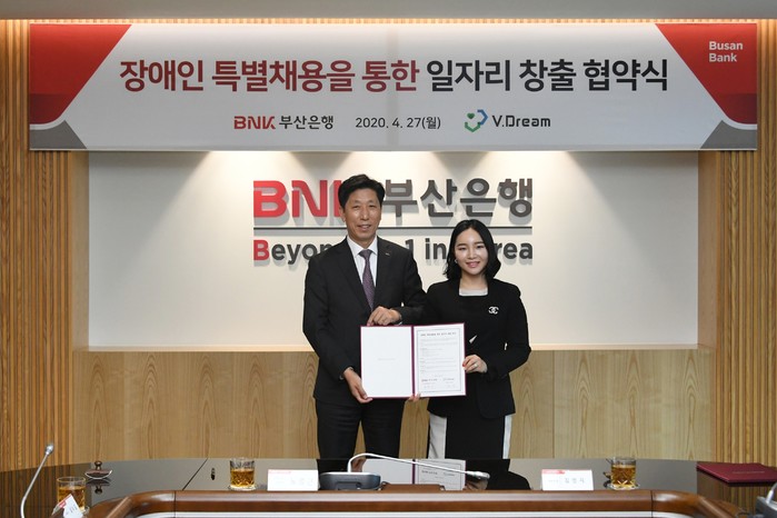 [시민일보 = 여영준 기자] BNK부산은행은 27일 오후 부산은행 본점에서 (주)브이드림(V.Dream)과 ‘장애인 특별 채용을 통한 일자리 창출’ 협약을 체결했다.