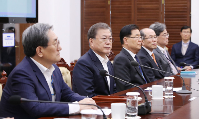 문재인 대통령이 3일 오후 청와대에서 열린 수석·보좌관 회의에서 발언을 마친 뒤 장내 정리를 기다리고 있다. /연합뉴스