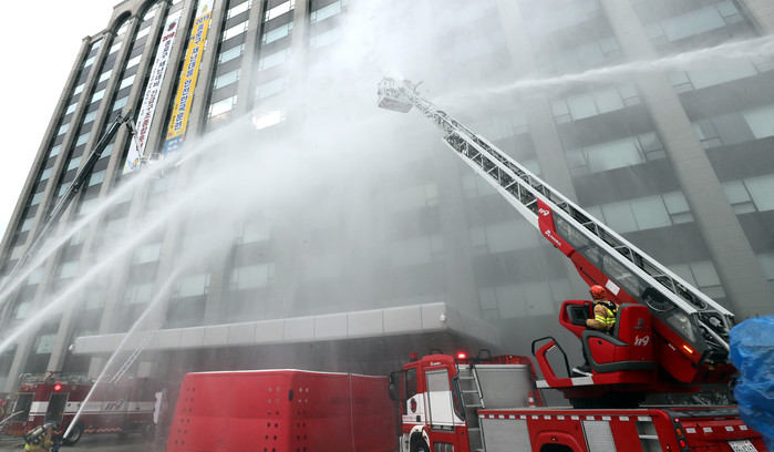 28일 서울 중구 계동 현대사옥에서 테러로 인한 화재 상황을 가정해 열린 재난대응안전한국훈련에서 고가 사다리차를 비롯한 소방장비가 화재진압을 위해 물을 뿌리고 있다.