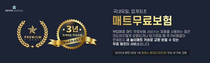 쁘띠메종이 선보이는 프리미엄 매트 새커버 무상교환 서비스 '매트무료보험' 은 파격적인 혜택 서비스로 지금 구매하시면 게시판 또는 고객센터 신청 만 한다면 추가비용 없이 무료배송, 무상 으로 새로운 놀이매트 커버를 교체 받을수 있다.