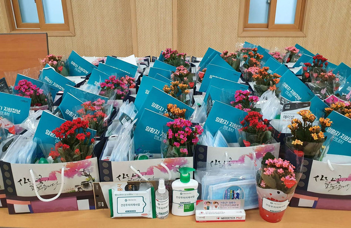 구성물품은 마스크, 손 세정제, 소독티슈 등의 생활위생용품과 코로나19로 지친 마음을 위로할 미니화분, 암환자에게 지원되는 정보를 담은 안내서이다.