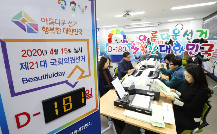 제21대 국회의원선거를 181일 앞둔 17일 오전 경기도 수원시 영통구 경기도선거관리위원회에서 직원들이 '국회의원선거 D-180일, 아름다운 선거-행복한 대한민국' 퍼포먼스를 하고 있다.