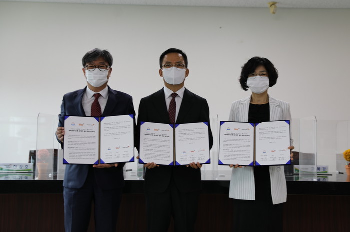 | ▲ (왼쪽부터) 한상호 월드비전 나눔본부장, 임금옥 bhc 대표, 고혜경 분당구청장이 ‘bhc치킨-성남시 분당구, 과속경보시스템 표지판 협약식’에서 기념촬영을 하고 있다. (사진제공=bhc치킨) |