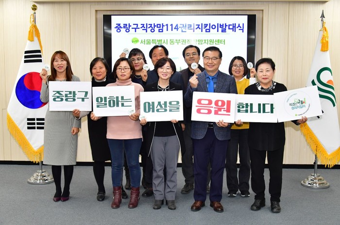 서울 중랑구는 12일 구청 기획상황실에서 동부권직장맘지원센터와 함께 직장에 다니며 자녀를 키우는 워킹맘의 노동권, 모성권, 인권을 보호하기 위한 '중랑구 직장맘 114권리지킴이 발대식'을 개최했다. 사진은 발대식에 참석한 류경기 구청장(오른쪽에서 두 번째)이 참여자들과 기념촬영을 하는 모습.(사진제공=중랑구청)
