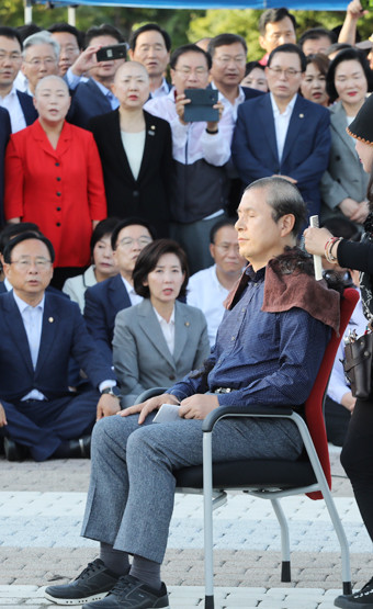 자유한국당 황교안 대표가 16일 오후 청와대 앞 분수대 광장에서 ‘조국 법무부 장관 파면 촉구’ 삭발식을 하고 있다. /연합뉴스