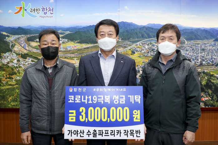 배현표 가야산수출파프리카작목반 대표는 “코로나19로 힘들고 지친 군민들에게 조금이라도 도움이 되고자 자발적으로 모은 성금 300만원을 기탁하게 됐다”고 하면서 “앞으로도 지역사회 나눔 문화 확산에 앞장서겠다”고 말했다.