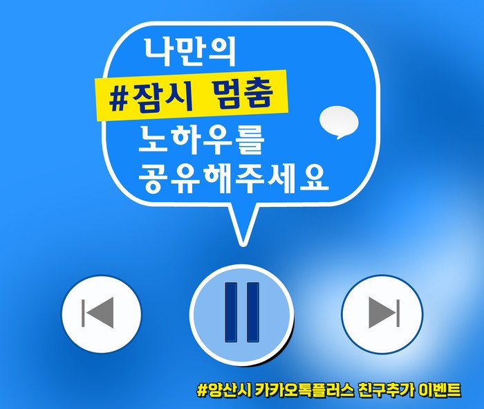 양산시는 양산시 카카오톡 채널을 통해 지난 11일부터 2021년 1월 10일까지 ‘#잠시멈춤 나만의 노하우를 공유해주세요’ 카카오톡 친구추가 채널 이벤트를 실시한다고 밝혔다.