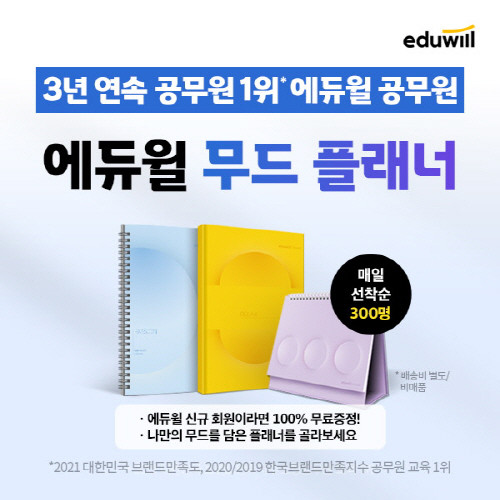 [시민일보 = 여영준 기자] 에듀윌은 첫 9급공무원 시험을 시작하는 수험생을 위해 매일 300명 한정으로 '무드 플래너 3종'을 무료 배포한다고 밝혔다.