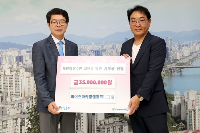 서울 성동구는 최근 와이즈 마케팅앤컴퍼니그룹(WISE M&C) 신철승 회장으로부터 북한이탈주민의 정착 지원을 위한 기부금 3500만원을 전달받았다. 사진은 이날 기부금 전달식 후 정원오 구청장(왼쪽)이 신 회장과 기념촬영을 하는 모습. (사진제공=성동구청)