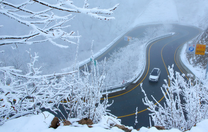 강원 산간에 폭설이 내린 28일 인제군 북면 한계리 한계령을 운행하는 차량이 서행하고 있다.