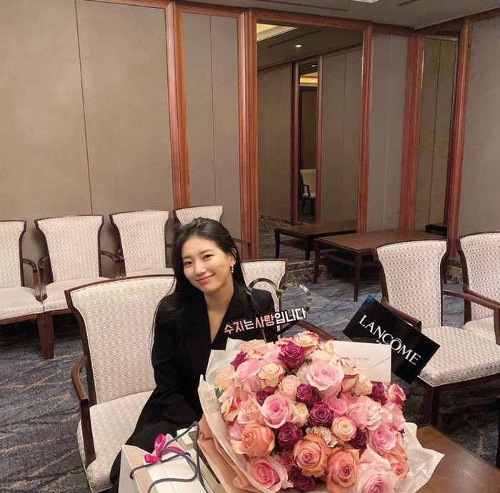 공개된 사진 속 수지는 화장품 브랜드 ‘lancome’에게서 받은 꽃다발을 옆에 두고 있는 모습이 포착됐다.
