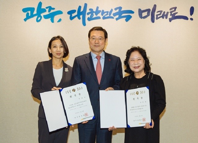 | 이용섭 광주광역시장이 8일 오후 시청 3층 접견실에서 광주시립예술단 예술감독 위촉식에 참석해 유영애 시립창극단 예술감독(오른쪽)과 최태지 시립발레단 예술감독(왼쪽)에게 위촉장 수여 후 기념 촬영을 하고 있다./광주광역시 제공 |