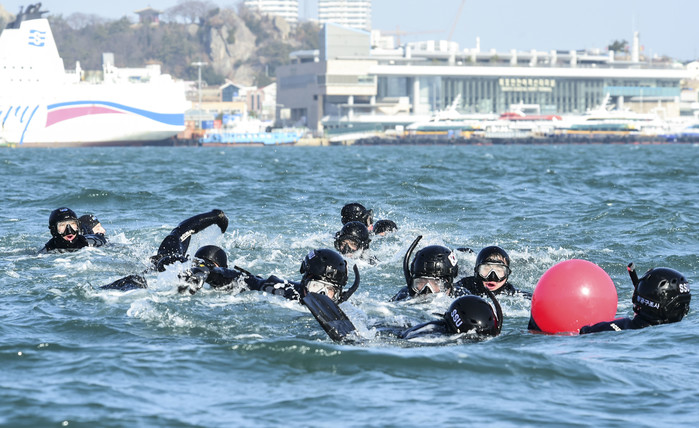 대한(大寒)인 20일 오전 해군 제3함대사령부 8구조작전중대 해난구조대원(SSU)들이 목포 군항 부두 앞바다에서 혹한기 훈련의 하나인 핀 마스크 수영을 하고 있다.