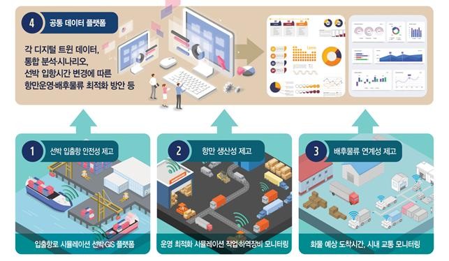 한국판 뉴딜 정책의 10대 대표과제에도 선정된 디지털 트윈 기술을 활용하여 실제 부산항과 동일한 가상현실을 구현하고, 선박 입출항 경로 ·시간·접안선석 변경 등 항만운영상 발생하는 여러 상황에 맞춰 터미널 운영사, 운송사 등 다양한 이해 관계자들이 최적화된 의사결정을 할 수 있게 지원하는 통합 플랫폼을 구축할 계획이다.