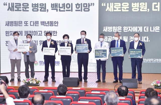 [광주=정찬남 기자] 이용섭 광주광역시장(좌측부터 5번)이 24일 오후 동구 전남대병원 명학회관에서 열린 '전남대병원 개원 111주년 기념식'에 참석해 안영근 전남대병원장, 정성택 전남대총장, 국회의원 등 내빈들과 퍼포먼스를 하고 있다.
