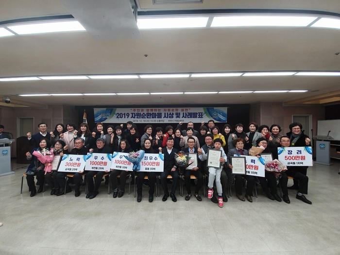 경기 부천시가 최근 시청 소통마당에서 ‘2019년 자원순환마을 시상 및 우수사례 발표회’를 개최하고 지역주민이 주도하는 자원 재활용 및 쓰레기 바른 배출 문화정착을 위한 1년간의 활동을 공유했다. 사진은 참여자들이 기념촬영을 하는 모습.(사진제공=부천시청)