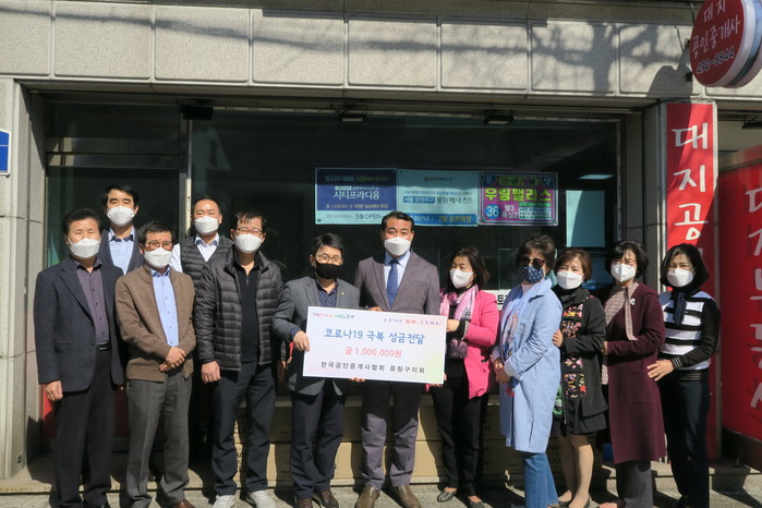 서울 중랑구는 최근 한국공인중개사협회 중랑구지회로부터 코로나19 극복을 위한 성금 100만원을 전달받았다. 한국공인중개사협회 중랑구지회 회원들이 모금한 이번 성금은 중랑구 사회복지협의회로 기탁됐다. 사진은 전달식에 참석한 관계자들이 기념촬영을 하는 모습.(사진제공=중랑구청)