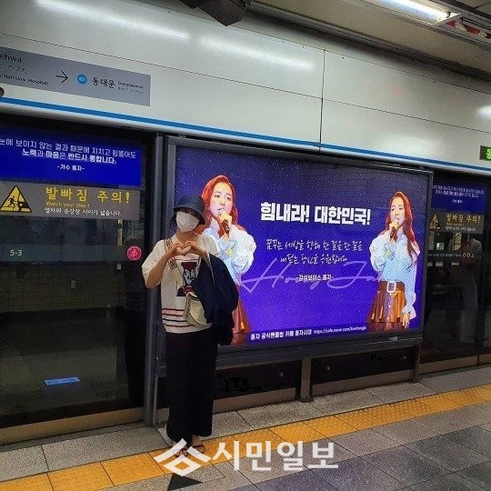 공개된 사진 속 홍자는 혜화역에 있는 팬 응원광고 앞에서 손하트로 감사한 마음을 드러내 훈훈함을 자아냈다.