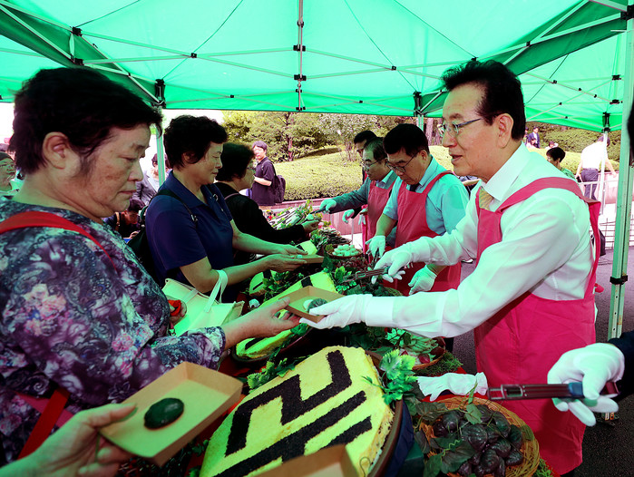 정순균 서울 강남구청장이 최근 구청 주차장에서 열린 ‘2019 추석맞이 직거래 장터’에 참석했다. 사진은 주민들에게 송편을 나눠주고 있는 정 구청장의 모습.(사진제공=강남구청)