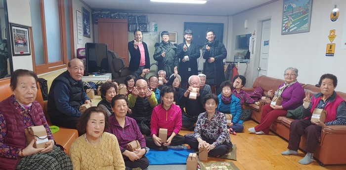 인천 미추홀구 학익2동 분회경로당은 최근 OCI 신입사원들이 미추홀구자원봉사센터 ‘수제청 만들기 프로그램’을 통해 만든 오렌지청과 자몽청 25병을 전달받았다. 사진은 수제청을 전달받은 경로당 노인들과 OCI 신입사원들이 기념촬영을 하는 모습.(사진제공=미추홀구청)