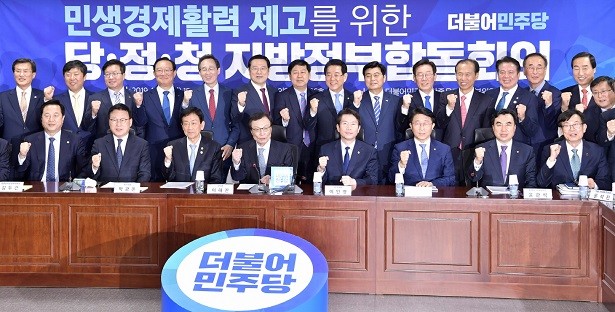 [광주=정찬남 기자] 이용섭 광주광역시장이 12일 오후 서울 국회 의원회관에서 열린 더불어민주당 민생경제활력 제고를 위한 당·정·청·지방정부 합동회의에 참석해 이해찬 더불어민주당 대표, 진영 행정안전부 장관, 김상조 청와대 정책실장, 시·도지사 등 참석자들과 회의에 앞서 기념촬영을 하고 있다./광주광역시 제공