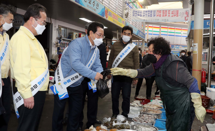 김영록 전남도지사는 코로나19 장기화로 어려움을 겪는 전통시장 상인들을 격려하고 설을 앞둔 방역상황을 점검하기 위해 10일 목포 종합수산시장에 이어 11일 순천 역전시장을 살폈다.