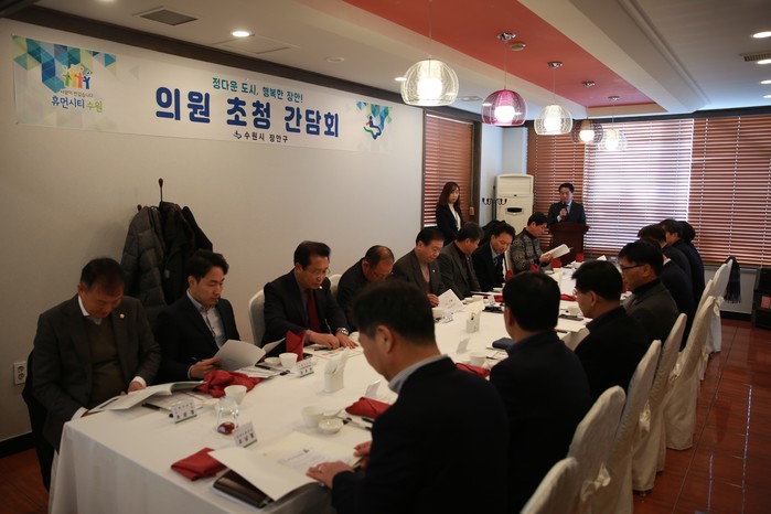 경기 수원시 장안구는 16일 시의회 장안구지역 시의원을 초청해 새해 주요업무와 현안사항 공유를 통한 구의 발전방향을 모색하기 위한 간담회를 개최했다. 이날 간담회에서 이병규 구청장은 참석한 시의원을 대상으로 주요업무와 영화동 청사 신축, 연무교 재가설 등 구의 주요 사업현황을 설명하고 해당 사업이 원활하게 추진될 수 있도록 적극적인 지원을 요청했다. 사진은 관계자들이 회의하는 모습.(사진제공=장안구청)