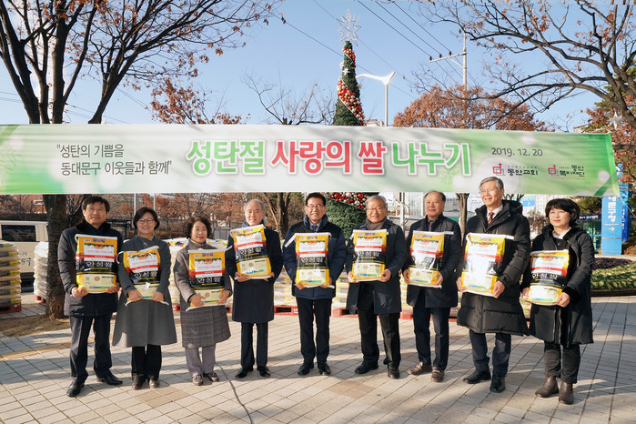 20일 서울 동대문구가 구청 앞 광장에서 ‘성탄절 사랑의 쌀 나누기’ 행사를 개최하고 동안교회로부터 사랑의 쌀 2600포를 전달받았다. 사진은 유덕열 구청장(가운데)과 김형준 동안교회 담임목사(오른쪽에서 네 번째) 및 관계자들이 기념촬영을 하고 있는 모습.(사진제공=동대문구청)