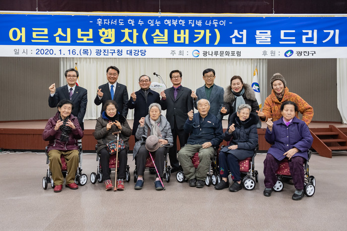 서울 광진구가 16일 구청 대강당에서 노인들을 위한 ‘보행차(실버카) 전달식’을 개최했다. 주민들로 구성된 광나루문화포럼에서 주최한 이번 전달식은 저소득층 노인들의 편의와 보행기 구입 비용 부담을 줄이고자 마련됐다. 사진은 전달식에 참석한 김선갑 구청장(뒷줄 왼쪽에서 두 번째) 및 참여자들이 기념촬영을 하는 모습.(사진제공=광진구청)