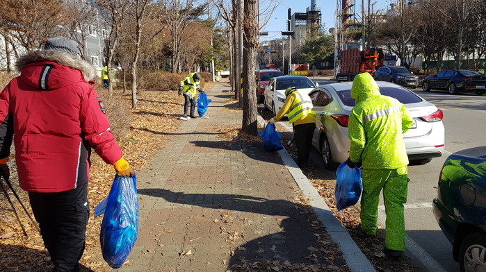 경기 동두천시는 최근 동두천 제1·2산업단지 미화원 미배치 구역인 도로와 인도 변에 적치된 모래와 낙엽 등의 묵은 쓰레기를 청소하기 위해 진공차와 가로미화원 전체 인력을 투입해 일제 합동청소를 실시했다. 사진은 관계자들이 쓰레기를 수거하고 있는 모습.(사진제공=동두천시청)