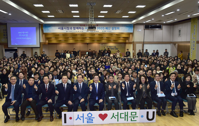 최근 서대문구청 대강당에서 주민 등 500여명이 참석한 가운데 '서울시장과 함께하는 2020 서울시 예산설명회'가 열렸다. 이날 박원순 시장은 예산이 어디에 어떻게 얼마만큼 쓰이는지에 대해 설명했다. 사진은 문석진 구청장 및 참석자들의 기념촬영 모습. (사진제공=서대문구청)