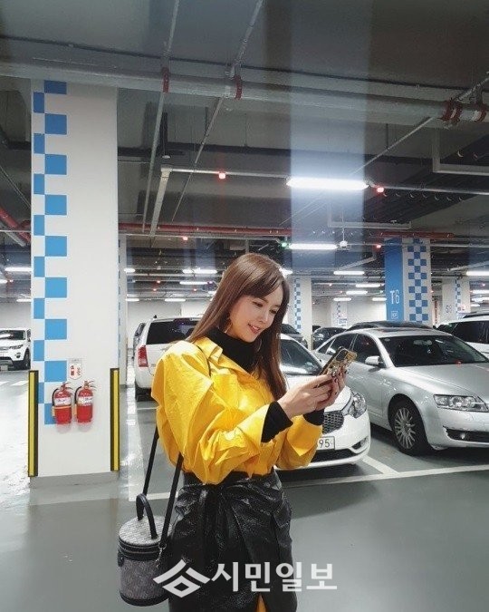 공개된 사진 속 장영란은 주차장에서 목폴라 티셔츠 위에 쨍한 노란 셔츠, 검은 가죽 치마를 입고 휴대폰을 바라보는 모습으로 시선을 사로잡았다.