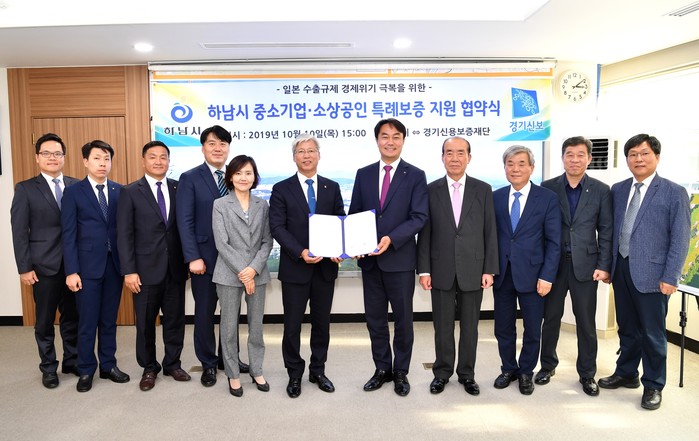 경기 하남시가 10일 경기신용보증재단과 일본 수출규제 경제위기 극복을 위한 '중소기업·소상공인 특례보증 지원 협약식'을 열고 지원을 늘리기로 했다. 사진은 협약 후 김상호 시장(오른쪽에서 다섯 번째)과 이민우 이사장 및 관계자들의 기념촬영 모습. (사진제공=하남시청)