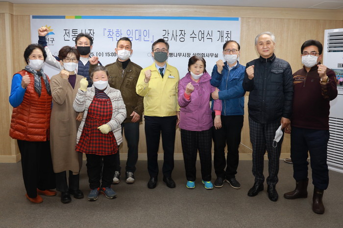 서울 금천구는 최근 임대료를 자발적으로 인하해 은행나무시장 상인들에게 큰 희망과 용기를 준 '착한 임대인' 3명에게 감사장을 전달했다. 금천구 은행나무시장에서는 지역사회에 코로나19 확산되기 시작한 지난 2월부터 임대인 3명이 ‘착한 임대료 운동’에 자발적으로 동참해 총 6개 점포의 임대료를 20~30%를 인하했다. 사진은 감사장 수여식에서 유성훈 구청장(가운데)과 착한 임대인, 상인회 관계자들이 기념촬영을 하고 있는 모습.(사진제공=금천구청)